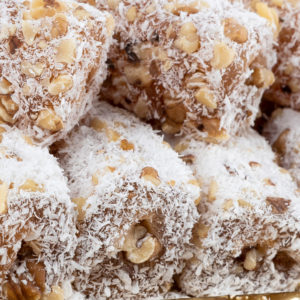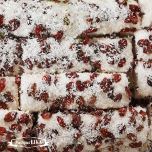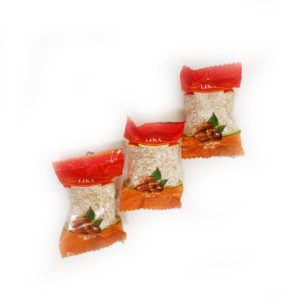 Llokume e paketuar nje nga nje me arra te fresketa dhe arre kokosi.