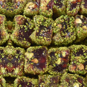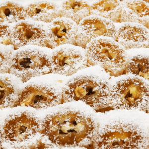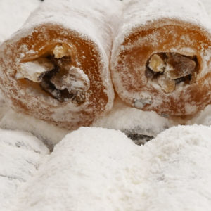 Suxhuk speical i paketuar nje nga nje ne vaskete me arra te fresketa dhe brenda me grimca arre dhe puder sheqeri jashte.